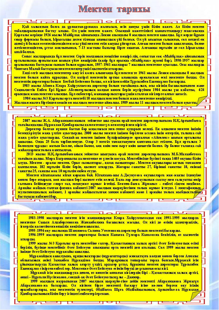 1983 жылы Абиева Клара Хайруллаевна директор болып тағайындалып, осы кісінің басшылығымен және Социалистік Еңбек Ері Құдыс Абсеметұлының қолдап көмек беріп жүгіруімен 1984 жылы үш қабатты, 624 орындық жаңа мектеп салынды. Бұл еңбектері, жанашырлықтары үшін аталған кісілерге алғыс шексіз.
